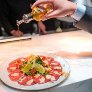 • Carpaccio de res: “Tiene un corazón de queso parmesano; está marinado y asado alrededor, pero su centro es crudo. Se enrolla, se congela y se taja. Para darle el toque fresco, se acompaña con rúgula, aceite balsámico y vinagreta”.
